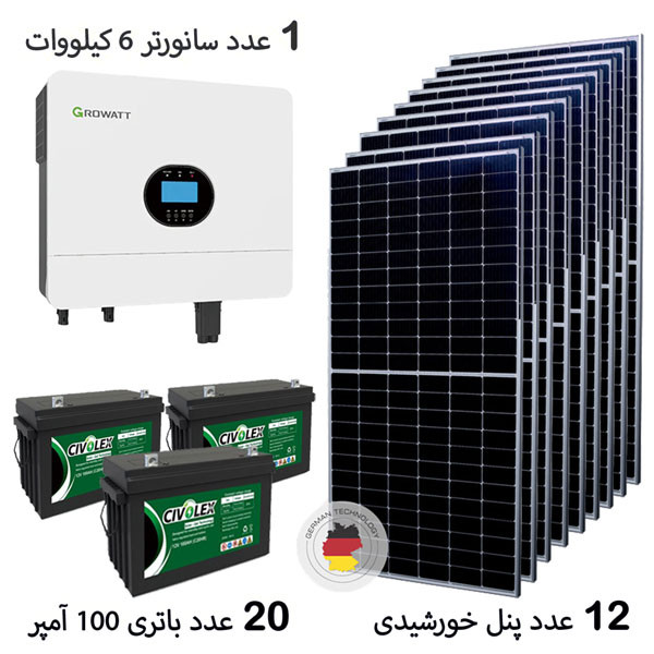 - یک عدد سانورتر (اینورتر/شارژر) 6000 وات با شارژکنترلر 100 آمپر MPPT برند گرووات